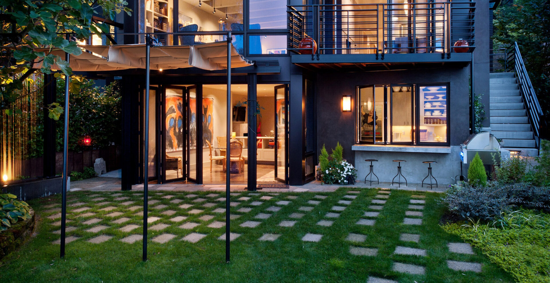 A canvas awning extends the living area outdoors, providing shade and shelter while framing a lush garden setting. Together, these elements create a warm, flexible dwelling that complements the main residence and offers a welcoming, long-term stay experience for family and guests.