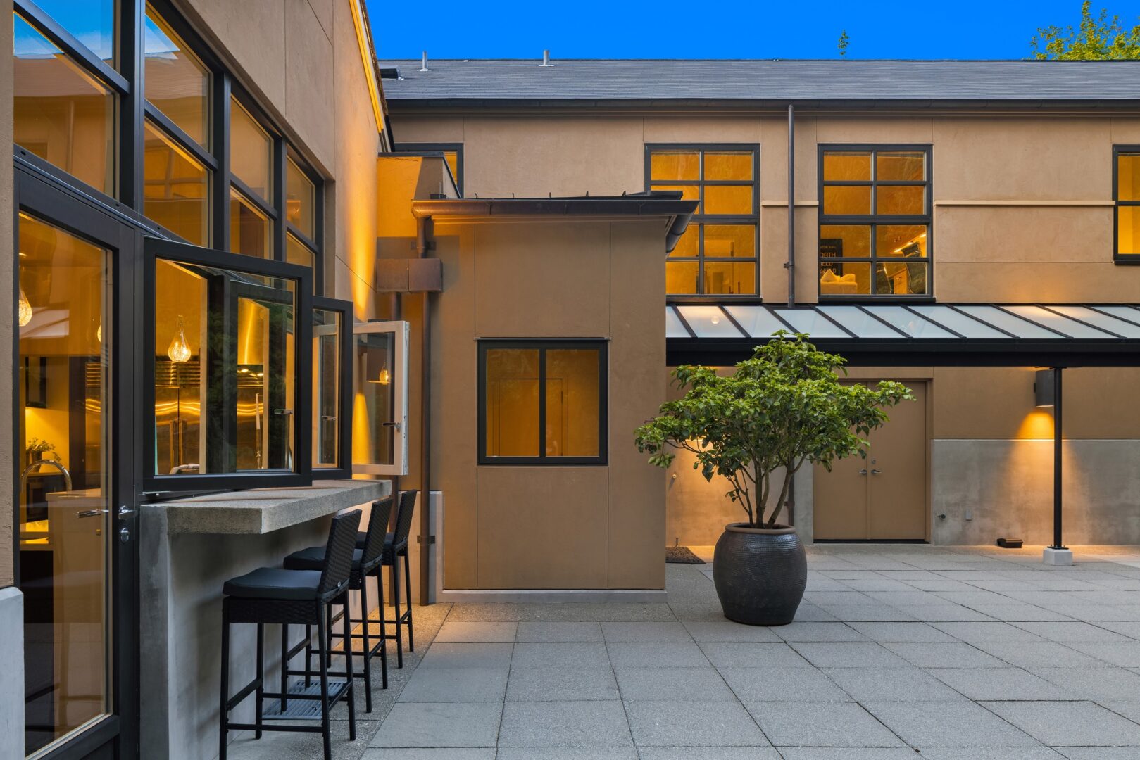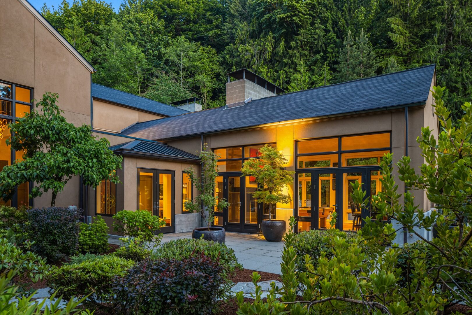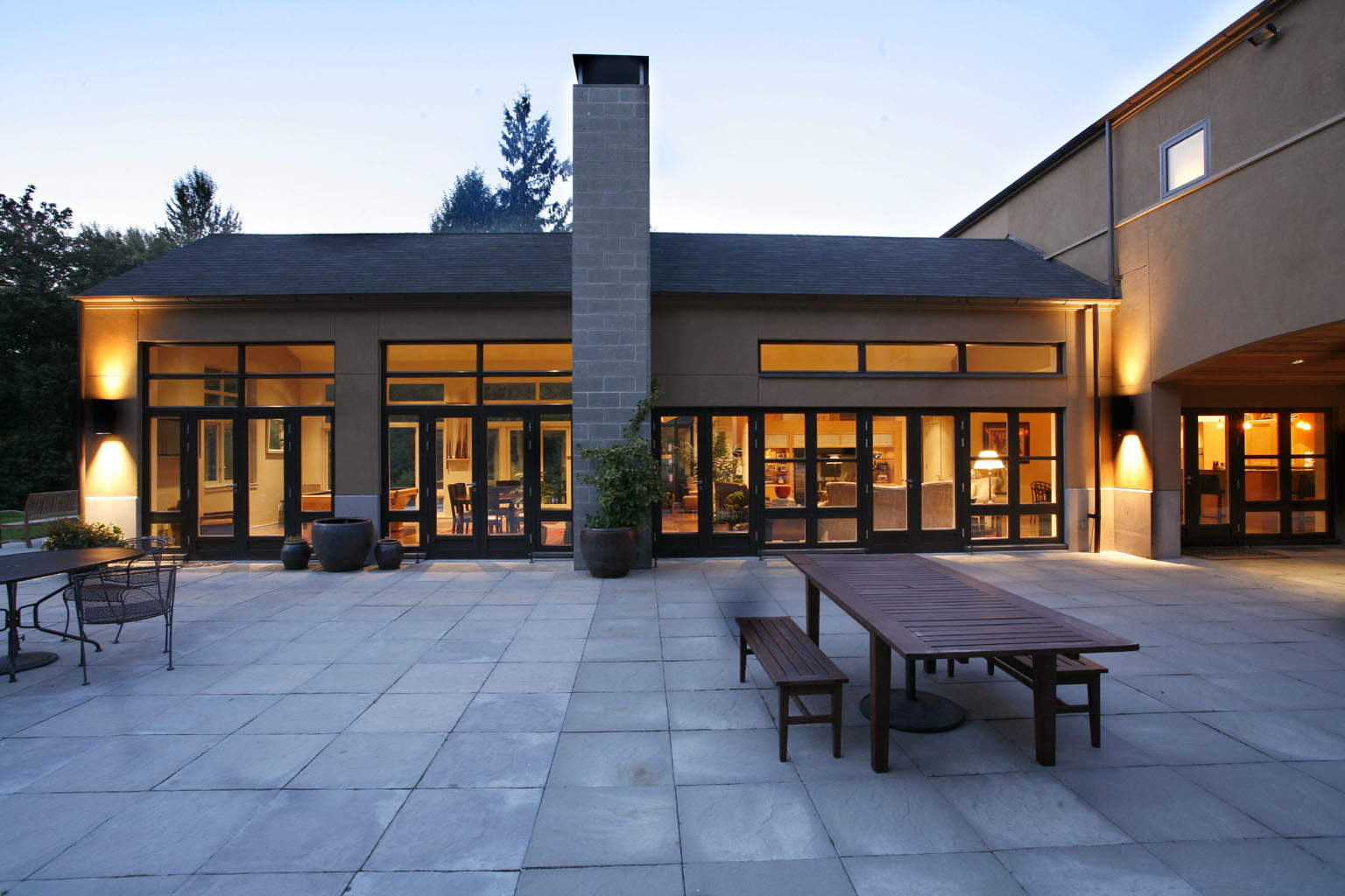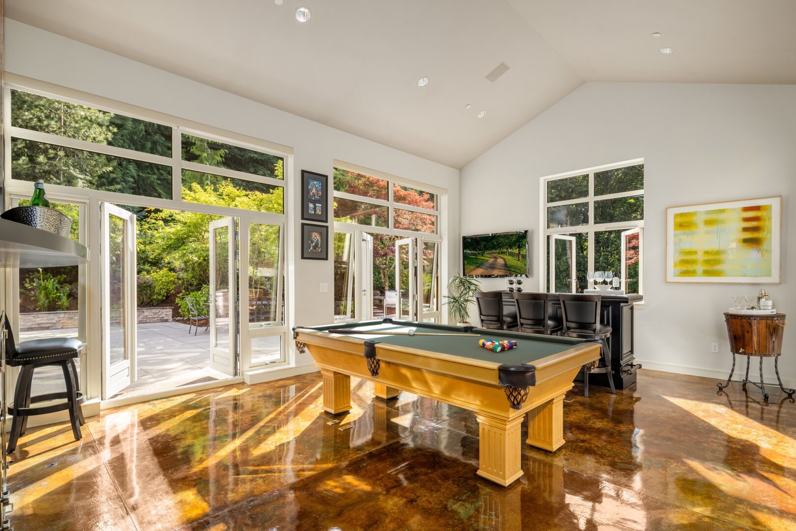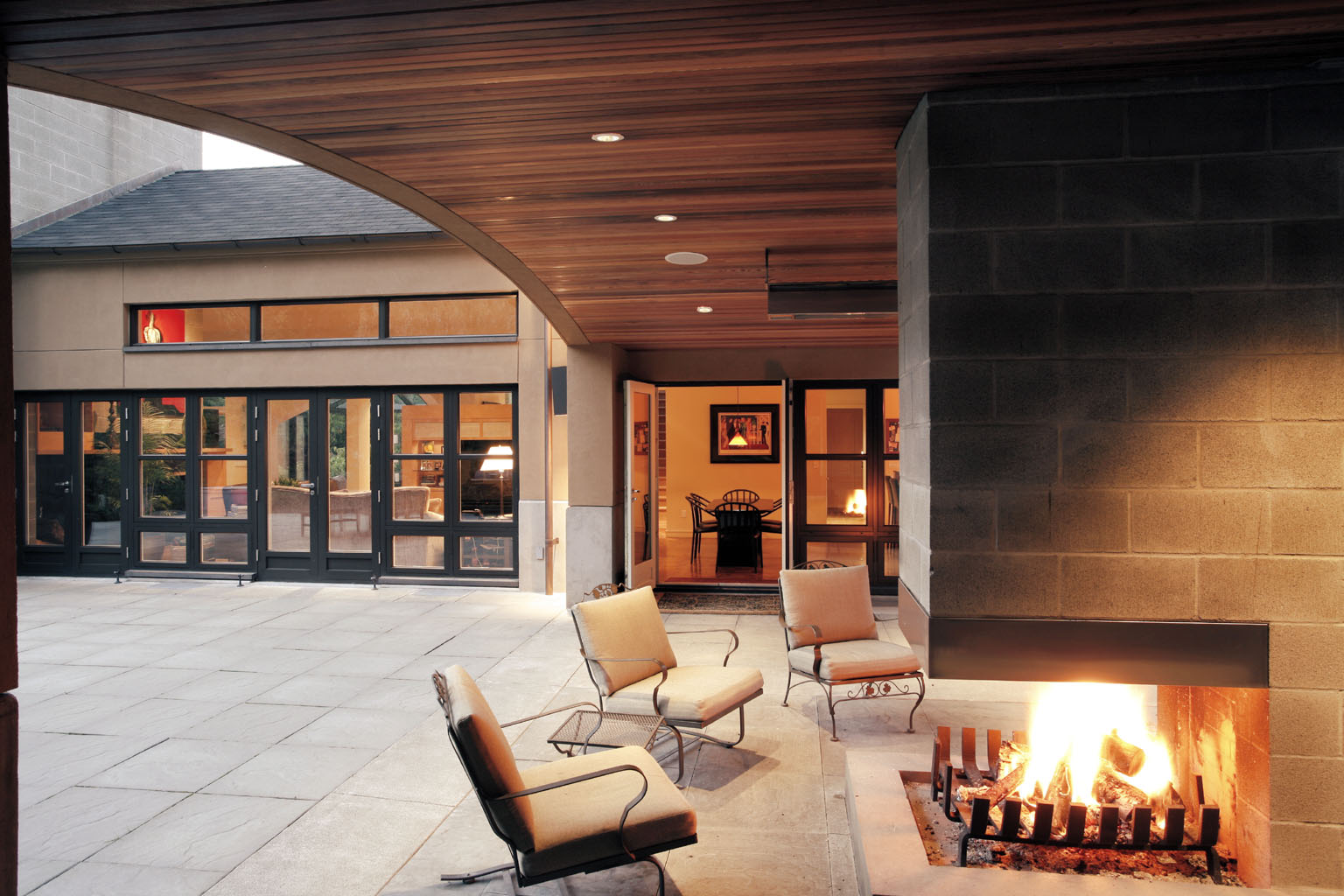A clear ordering system organizes public and private spaces, with an open central core housing the living, dining, kitchen, and game rooms. The most recent addition, known as The Bridge, introduces an outdoor living room with a fireplace below and a new primary bedroom wing above, further reinforcing the home’s layered relationship to site and family life.
