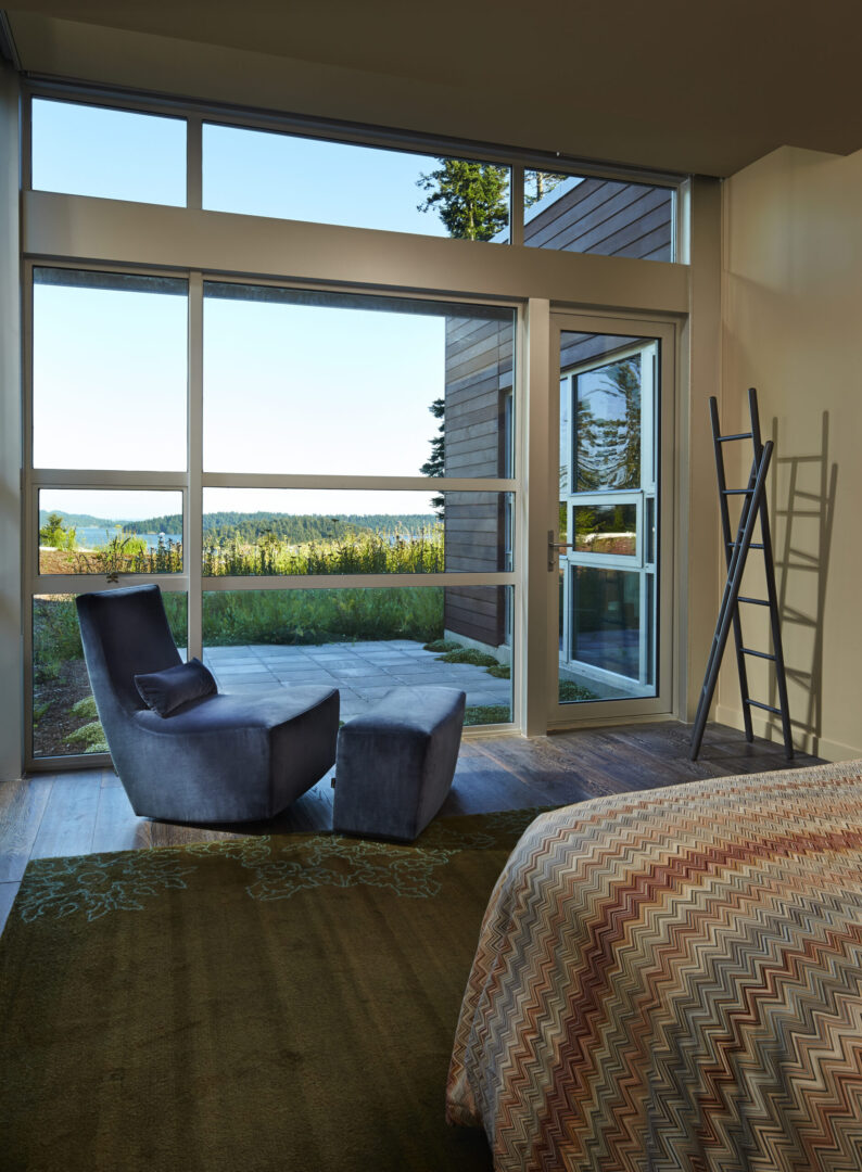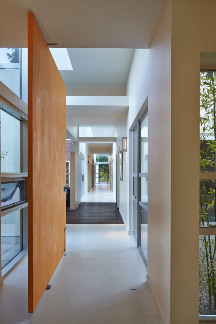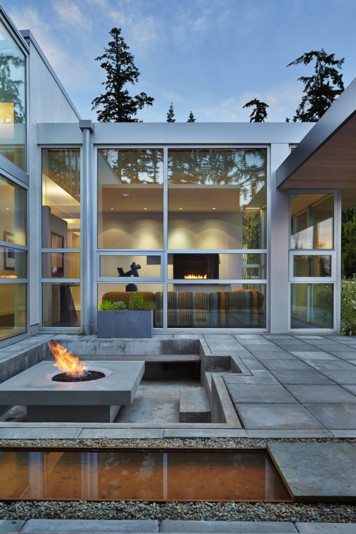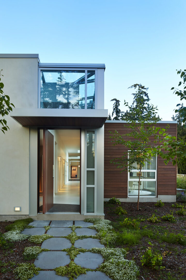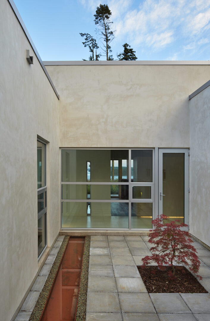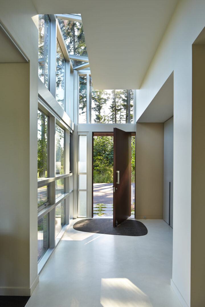 Named for its expansive views, this contemporary hillside residence is designed to frame the distinctive landscapes of a Puget Sound bay. The plan is organized around a primary and secondary circulation axis, with living spaces branching outward and a series of inner courtyards punctuating the sequence to create layered views and visual connections throughout the home.