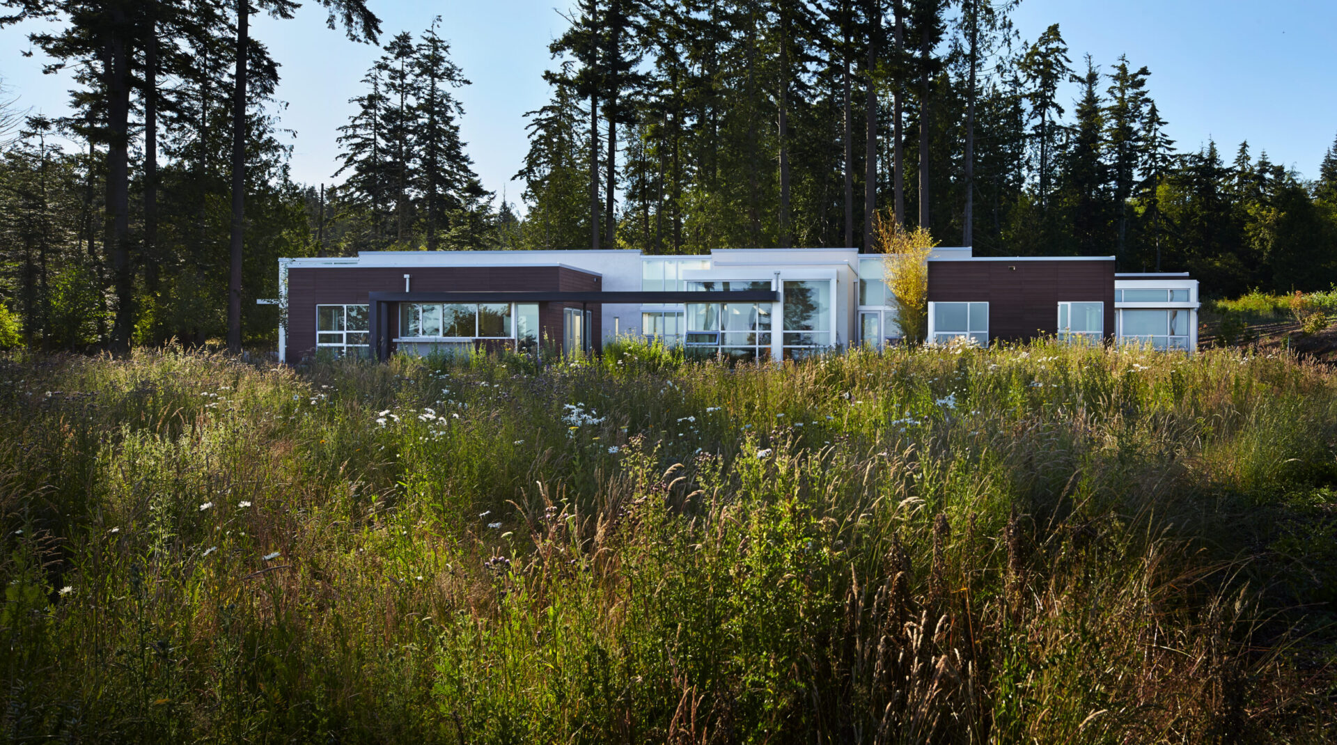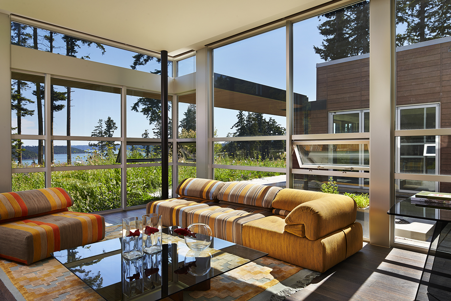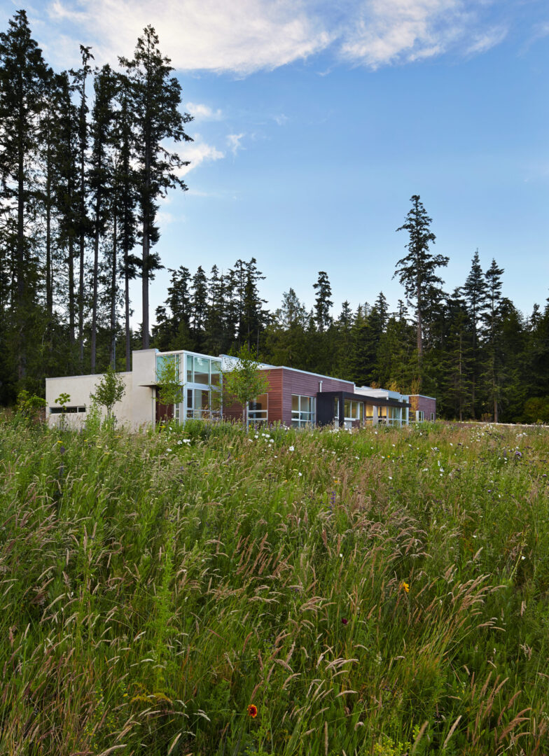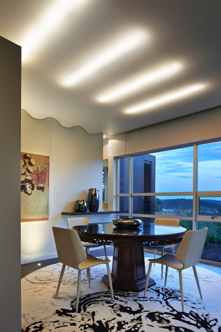 Named for its expansive views, this contemporary hillside residence is designed to frame the distinctive landscapes of a Puget Sound bay. The plan is organized around a primary and secondary circulation axis, with living spaces branching outward and a series of inner courtyards punctuating the sequence to create layered views and visual connections throughout the home.