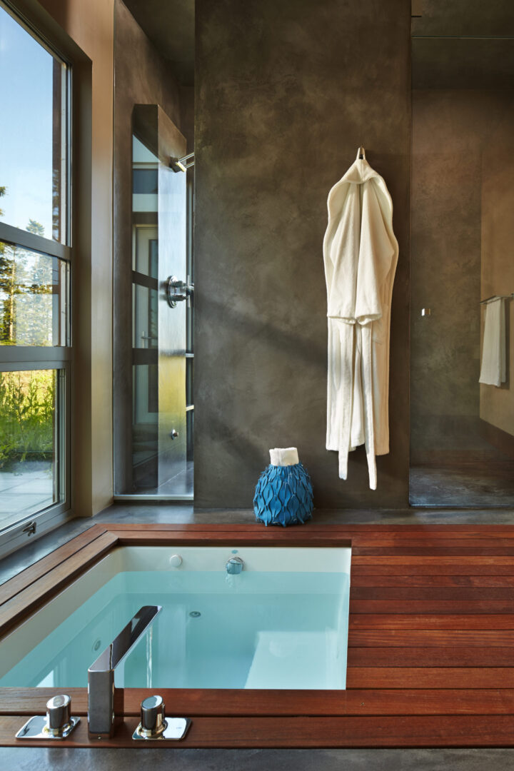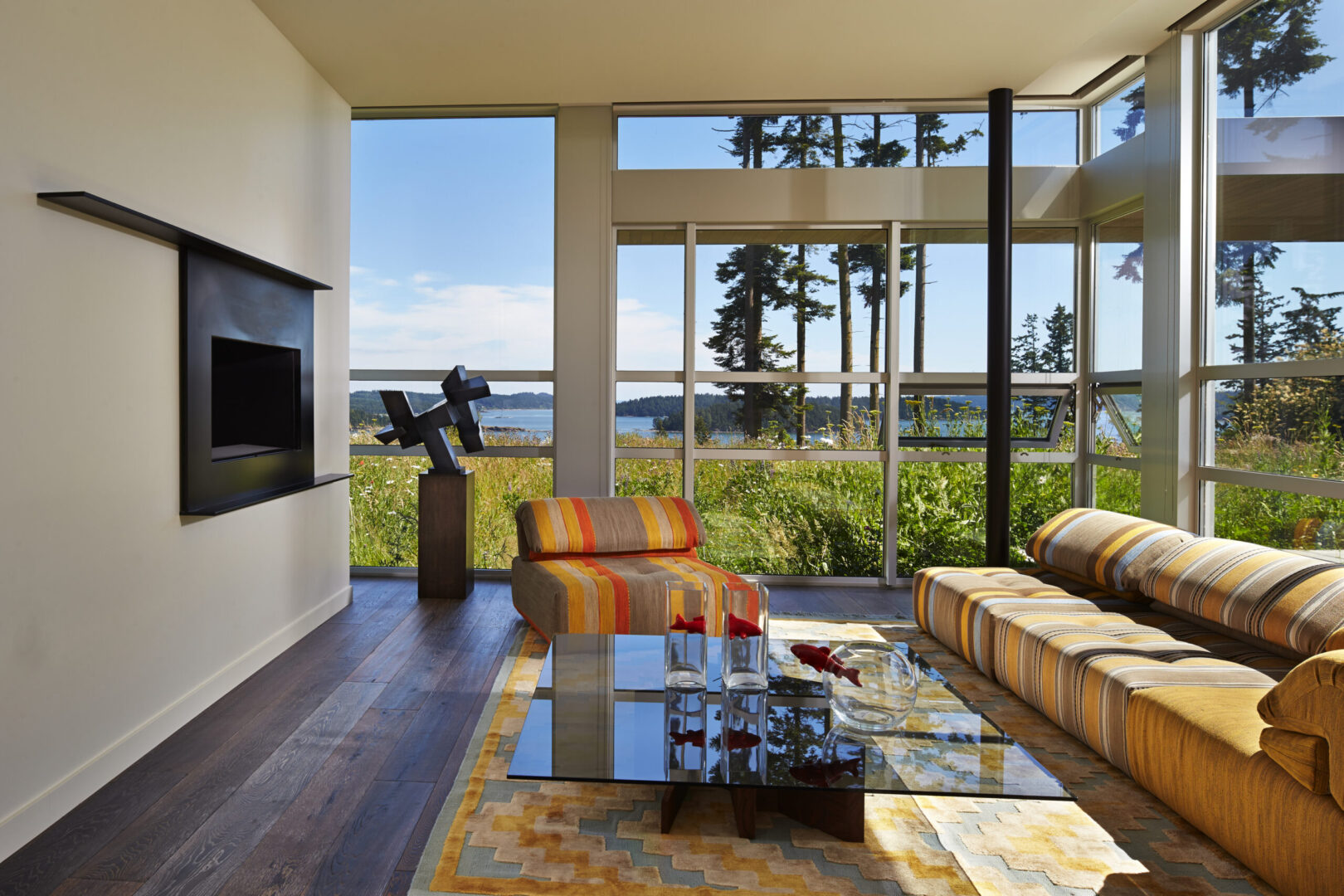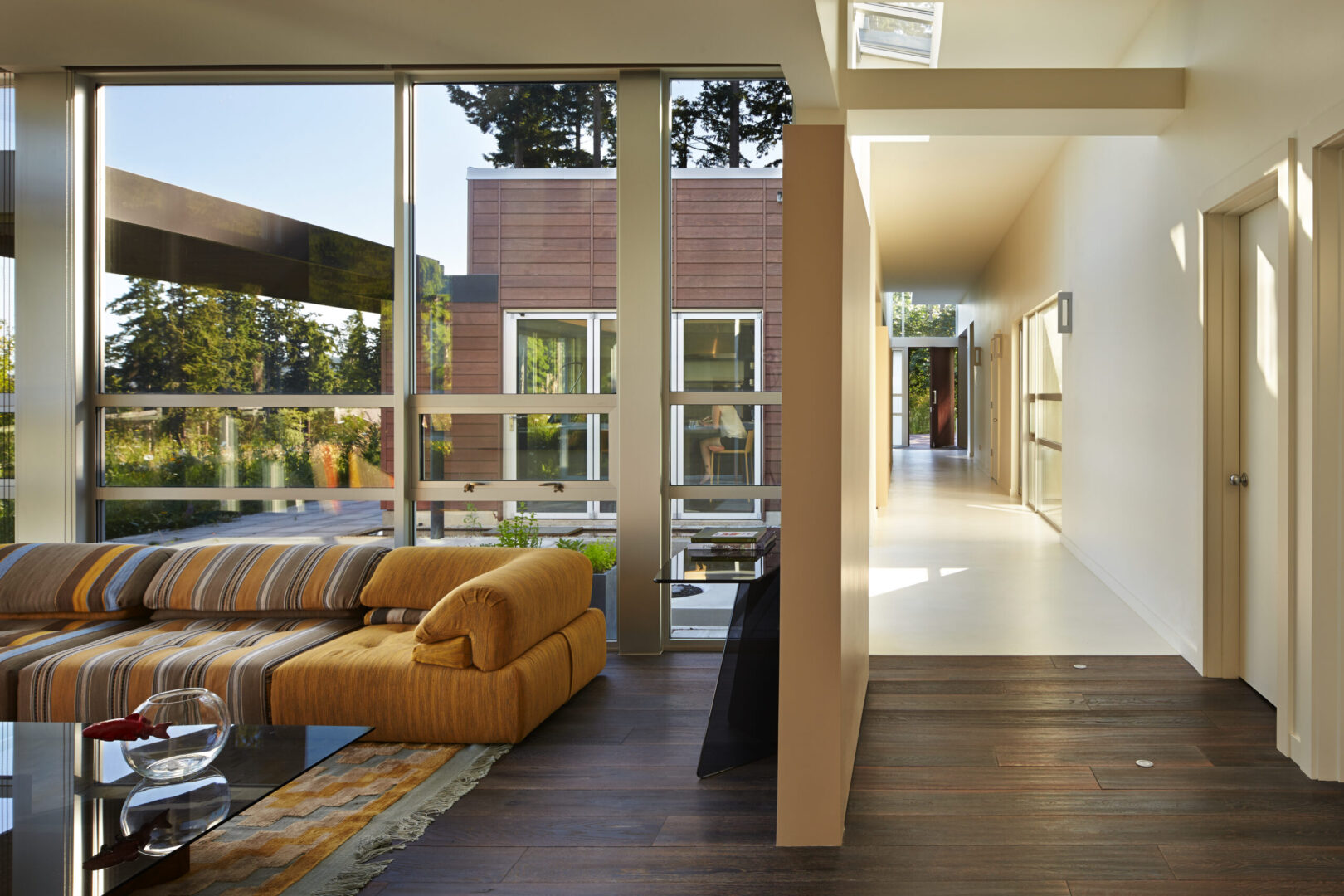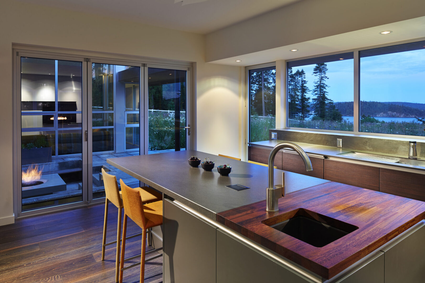 Named for its expansive views, this contemporary hillside residence is designed to frame the distinctive landscapes of a Puget Sound bay. The plan is organized around a primary and secondary circulation axis, with living spaces branching outward and a series of inner courtyards punctuating the sequence to create layered views and visual connections throughout the home.