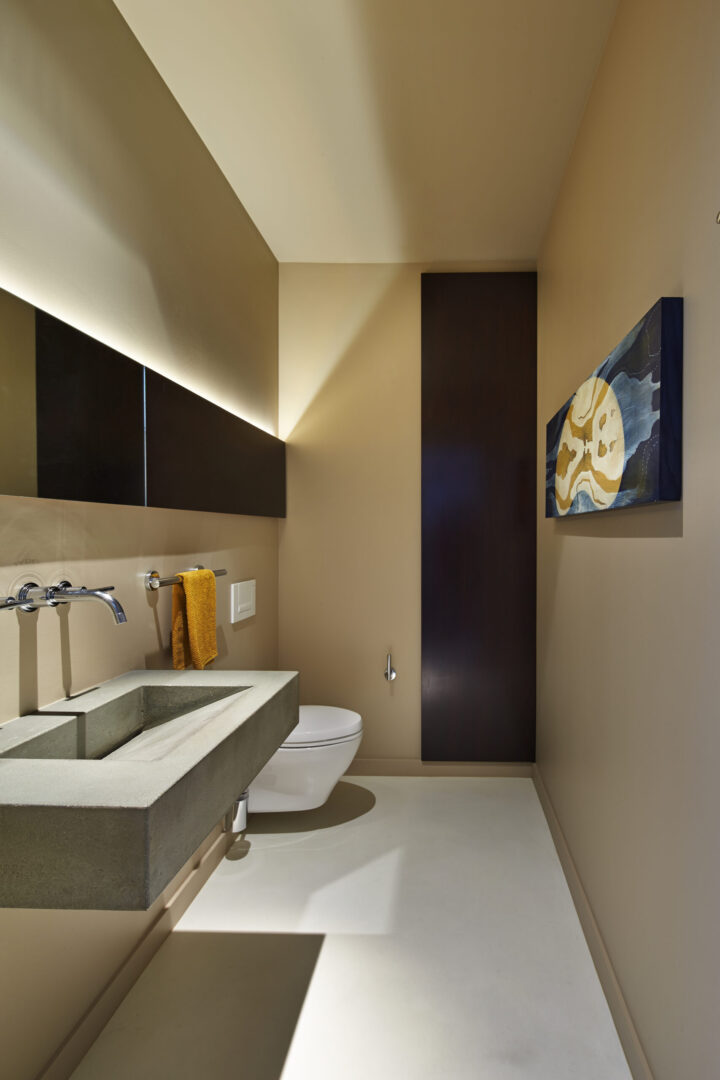 Public and private zones are clearly defined by a large pivot door along the main axis, allowing the house to shift between open and closed modes of use. The secondary axis was conceived for future expansion, ensuring the home can adapt over time. A commitment to craftsmanship is evident throughout, most notably in the finely detailed kitchen—a central gathering space where the owners spend much of their time.