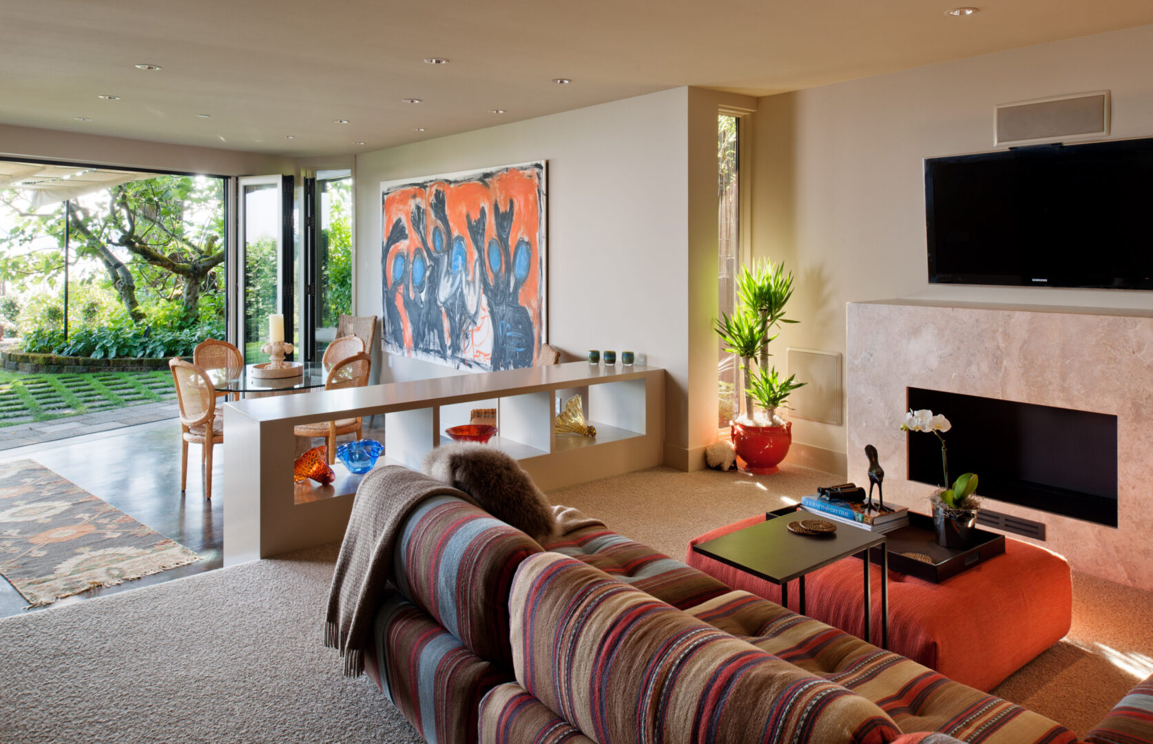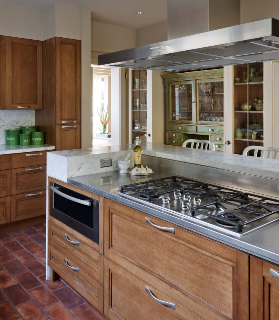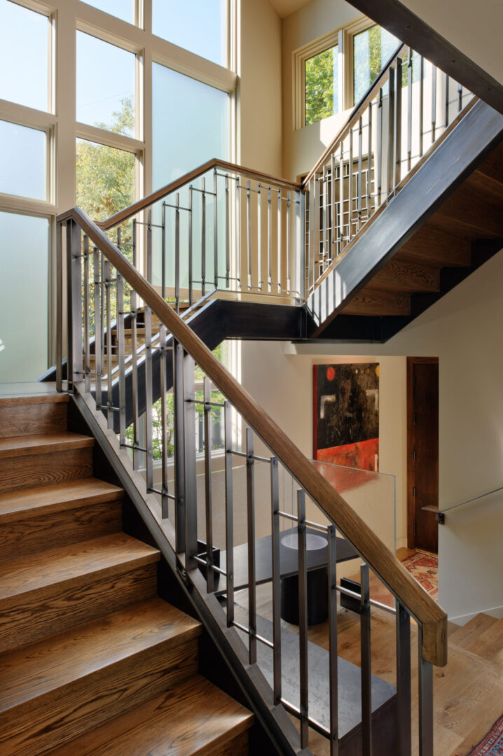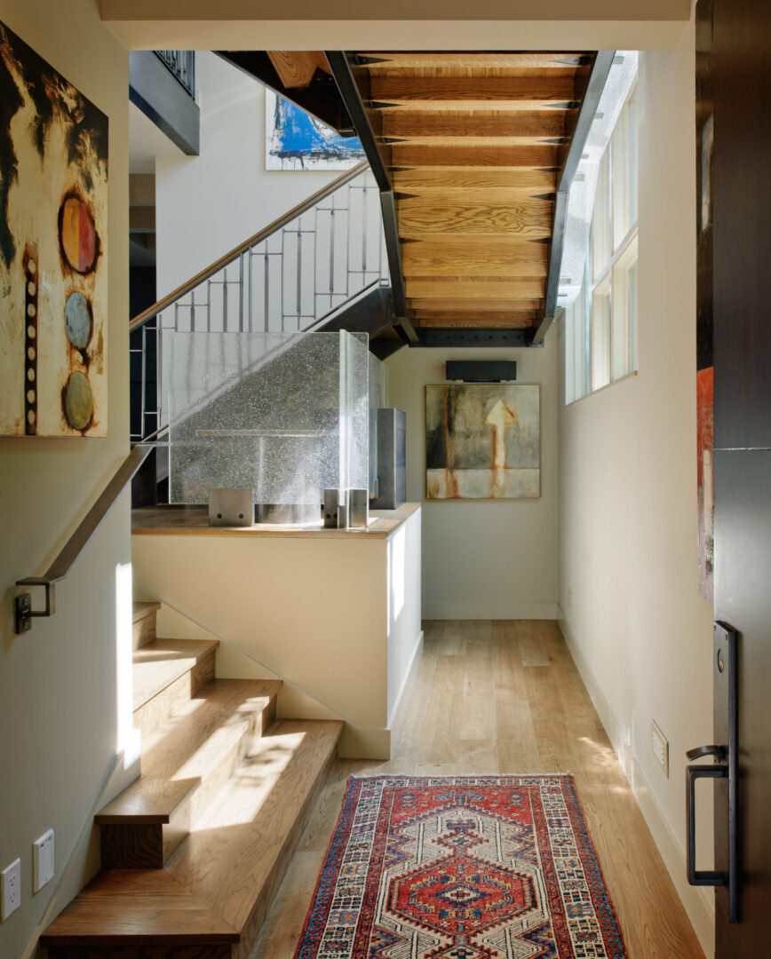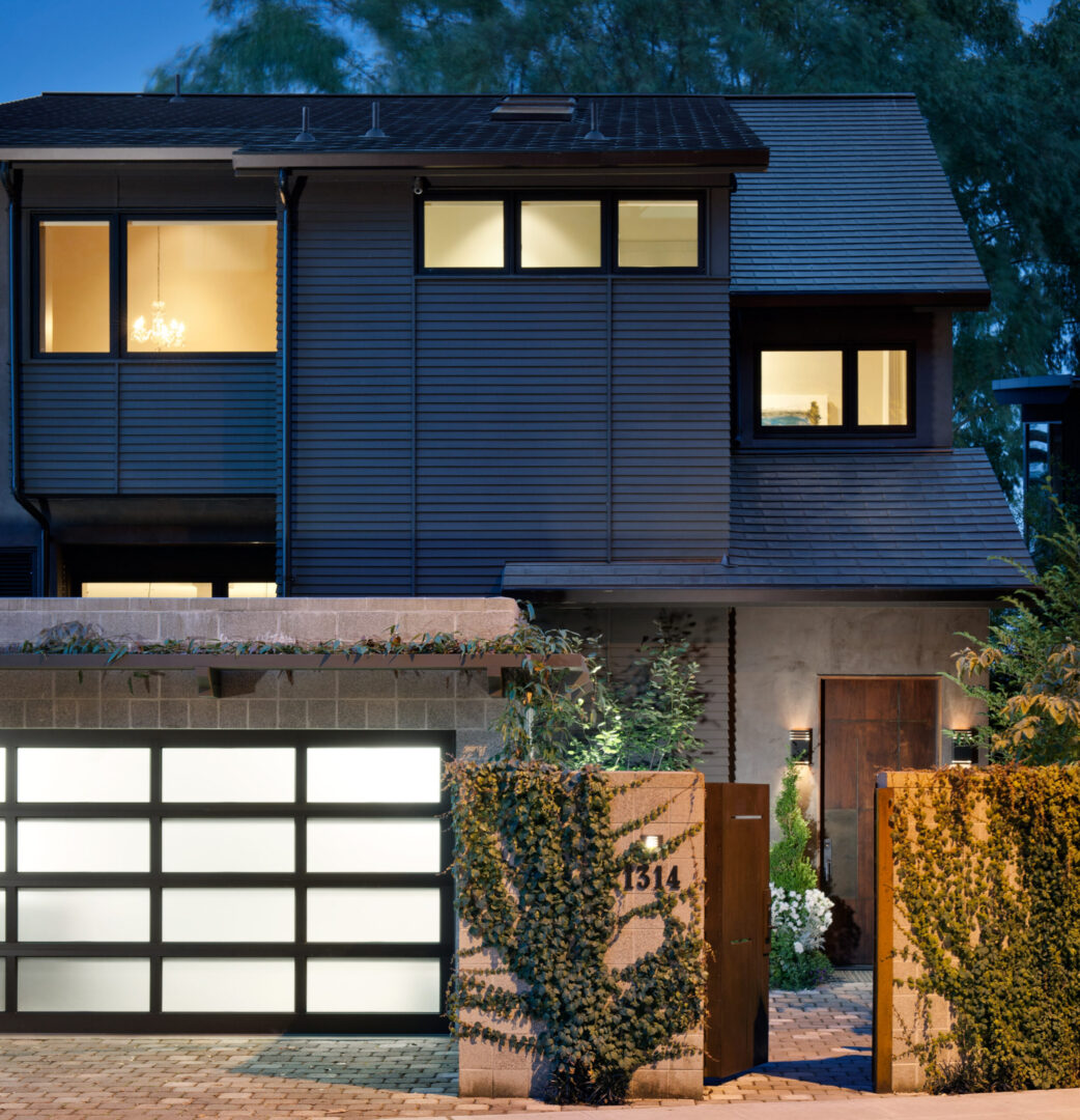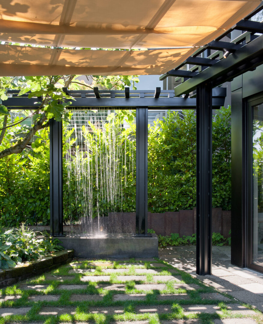 Sustainability is integrated throughout the design. Rainwater is collected and expressed as a visible landscape feature—flowing from a steel downspout onto a trellis, through a garden creek, and into an underground cistern for irrigation. A high-efficiency radiant hot water system provides comfortable, low-energy heating, while copper shingles reclaimed from the original house are reimagined as part of the new roof.