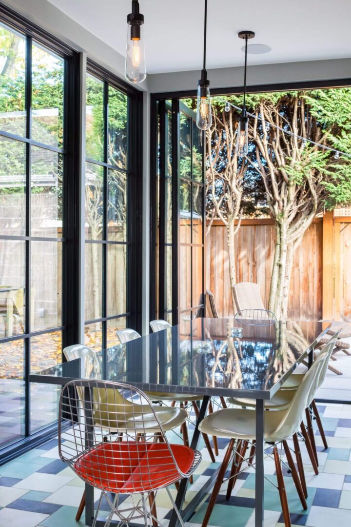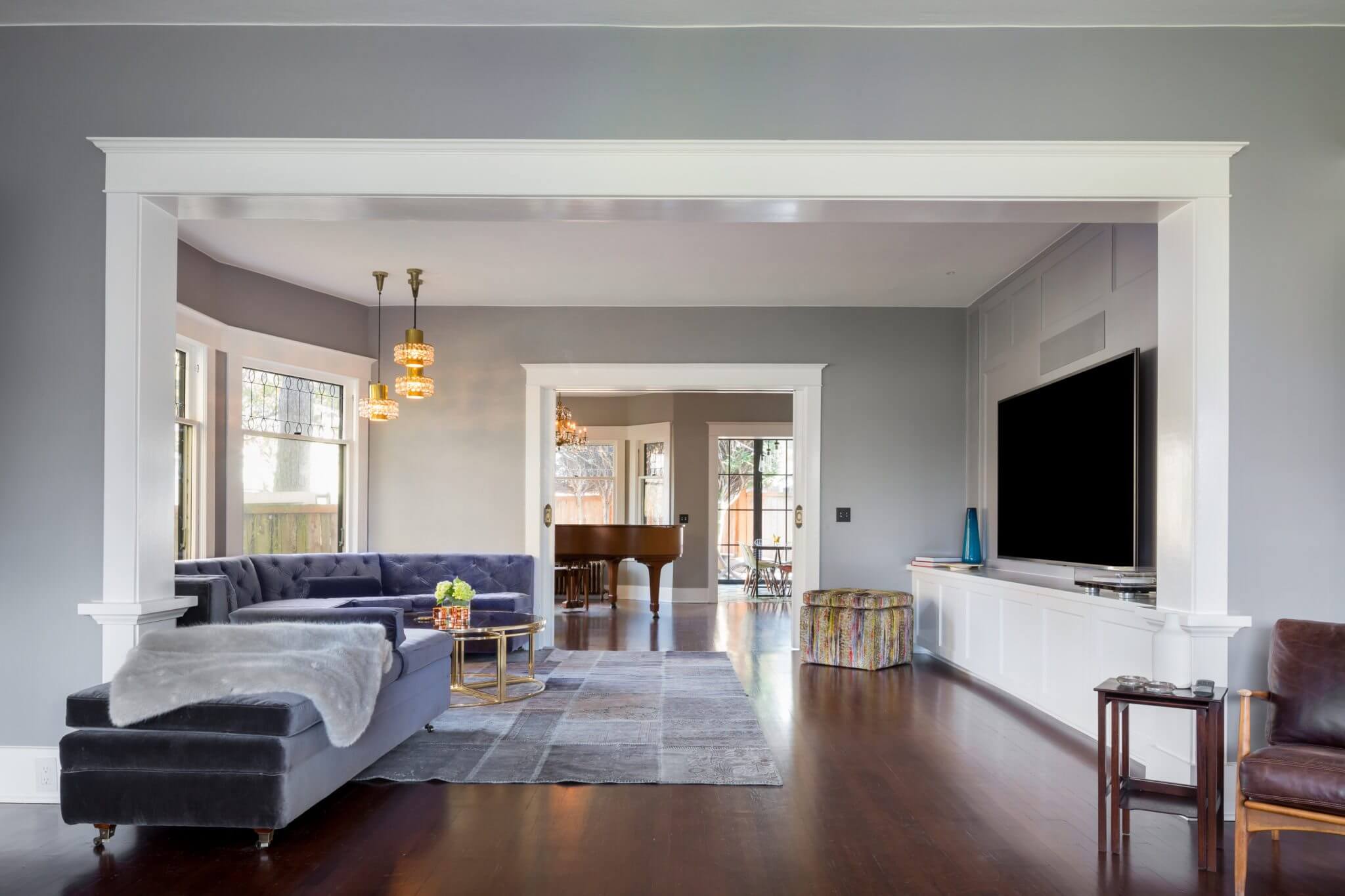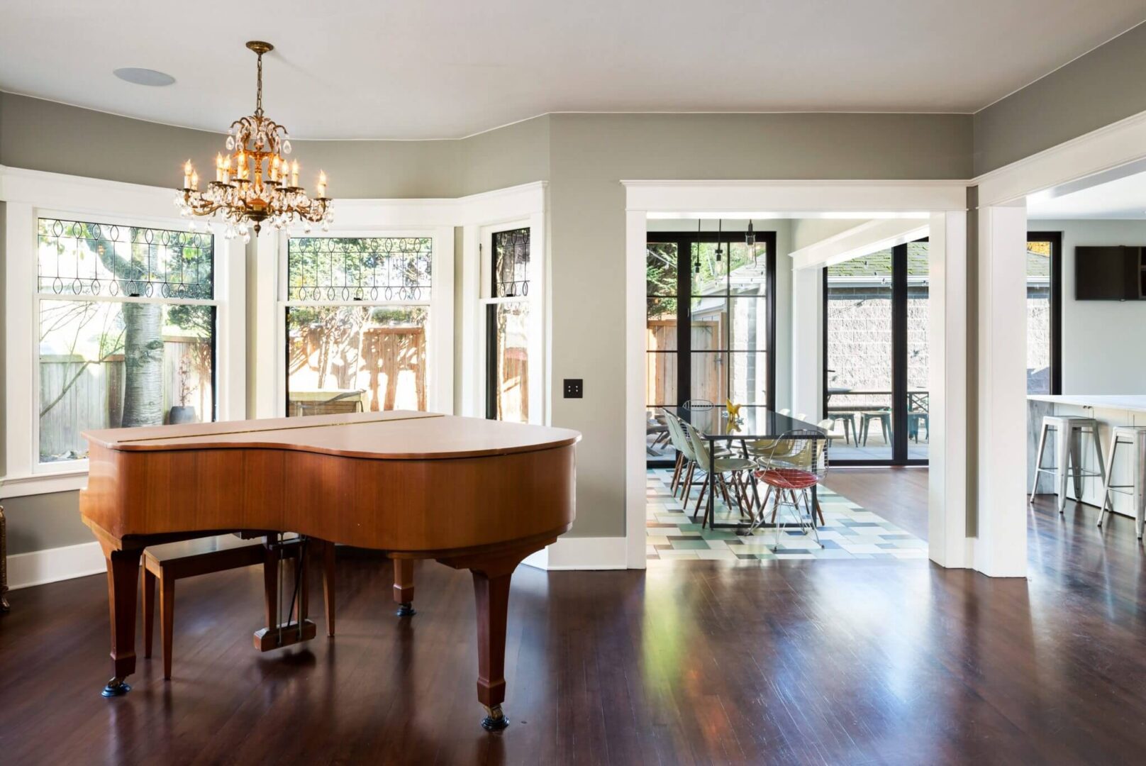 The addition of Sunroom, with large windows and bi-folding doors, creates a strong connection between the house and backyard. Opening up the walls between living spaces while respecting the character of the house, allows for an open flow between spaces from Living Room, to Media Room, Piano Room and Kitchen.